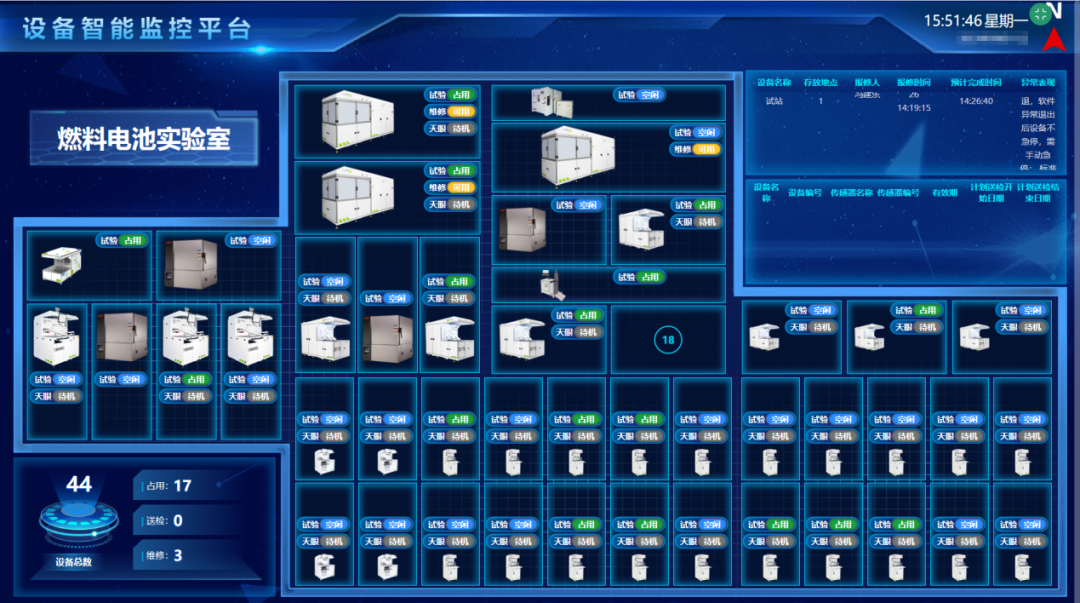 同時(shí),本期項(xiàng)目根據(jù)實(shí)驗(yàn)室設(shè)備的使用情況與狀態(tài),設(shè)計(jì)了設(shè)備智能監(jiān)控的可視化駕駛艙展示,按照實(shí)驗(yàn)室現(xiàn)場(chǎng)的實(shí)際布局俯瞰圖,動(dòng)態(tài)監(jiān)視試驗(yàn)主設(shè)備的當(dāng)前運(yùn)行狀態(tài),幫助實(shí)驗(yàn)室管理人員實(shí)時(shí)監(jiān)測(cè)實(shí)驗(yàn)室設(shè)備的運(yùn)行與使用情況,提高了實(shí)驗(yàn)室的資源利用效率。