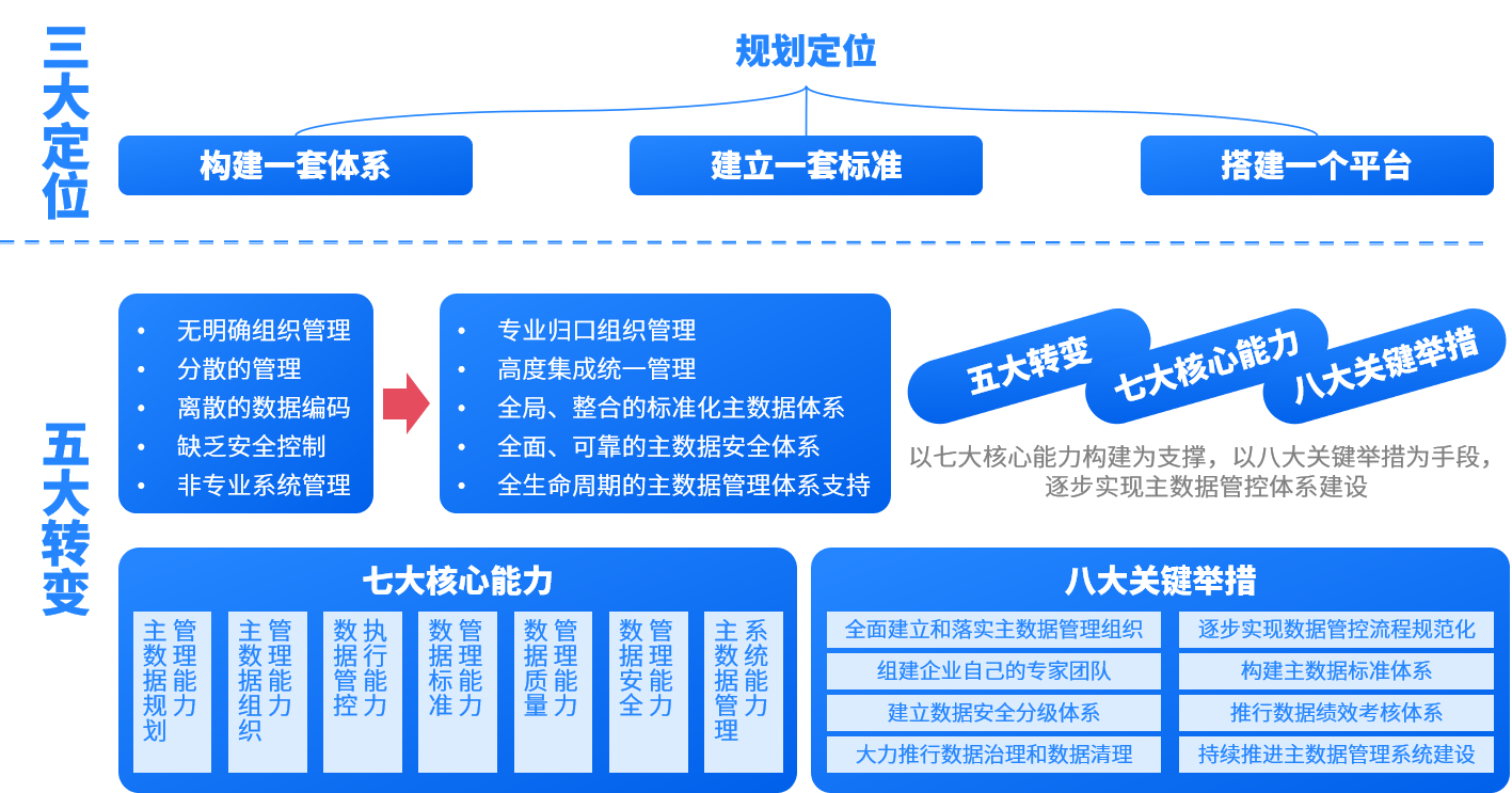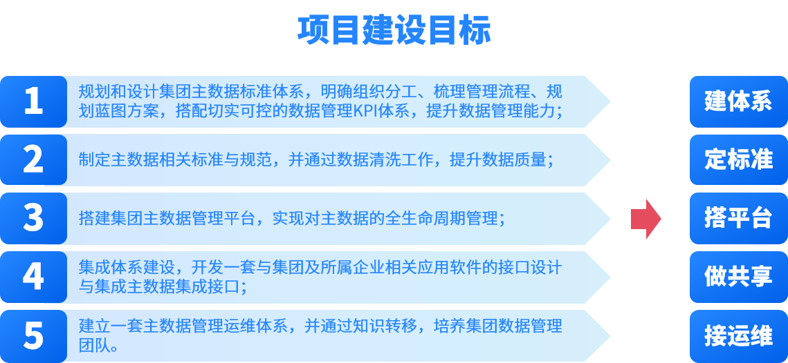 隨著該集團(tuán)業(yè)務(wù)的不斷擴(kuò)展,形成了綠色投資、工程服務(wù)、和高端制造三大業(yè)務(wù)板塊,各類業(yè)務(wù)數(shù)據(jù)不斷增加累積,現(xiàn)已沉淀物料、組織機(jī)構(gòu)、員工、客戶、供應(yīng)商等基礎(chǔ)數(shù)據(jù)。集團(tuán)信息化需求和信息化建設(shè)在此期間也經(jīng)歷了一個從無到有、從簡單到復(fù)雜的逐步深入的過程,從而使得一些需要在整個企業(yè)范圍內(nèi)各個系統(tǒng)中共享的基礎(chǔ)數(shù)據(jù)被分散到各個系統(tǒng)分別管理,導(dǎo)致公司的主數(shù)據(jù)在不同系統(tǒng)中編碼不一致,主數(shù)據(jù)管理缺乏一致性、準(zhǔn)確性、完整性。 在此情況下,該集團(tuán)積極配合國家能源發(fā)展、節(jié)能減排戰(zhàn)略規(guī)劃,立足于客戶需求,秉承“增產(chǎn)節(jié)能,效益型環(huán)保”理念,堅持用科技的力量帶動環(huán)保事業(yè)的發(fā)展,亟需建立一個主數(shù)據(jù)管理系統(tǒng),通過該系統(tǒng)固化相關(guān)數(shù)據(jù)管理流程和管理規(guī)范,以支撐數(shù)據(jù)標(biāo)準(zhǔn)體系的貫徹執(zhí)行,從而更好地實(shí)現(xiàn)信息資源的充分共享和最大化利用。 一、建體系 規(guī)劃和設(shè)計集團(tuán)主數(shù)據(jù)標(biāo)準(zhǔn)體系,明確組織分工、梳理管理流程、規(guī)劃藍(lán)圖方案,搭配切實(shí)可控的數(shù)據(jù)管理KPI體系,提升數(shù)據(jù)管理能力,實(shí)現(xiàn)主數(shù)據(jù)管理的體系化、標(biāo)準(zhǔn)化和平臺化。構(gòu)建一套完整的主數(shù)據(jù)管理體系框架,充分考慮企業(yè)的信息系統(tǒng)及主數(shù)據(jù)需求的實(shí)際情況。 二、定標(biāo)準(zhǔn) 制定主數(shù)據(jù)相關(guān)標(biāo)準(zhǔn)與規(guī)范,并通過數(shù)據(jù)清洗工作,提升數(shù)據(jù)質(zhì)量;根據(jù)主數(shù)據(jù)分類明確相關(guān)管理組織以及職責(zé),制定物料主數(shù)據(jù)標(biāo)準(zhǔn)、管理流程和制度。 三、搭平臺 搭建集團(tuán)主數(shù)據(jù)管理平臺,實(shí)現(xiàn)對主數(shù)據(jù)的全生命周期管理;依據(jù)主數(shù)據(jù)標(biāo)準(zhǔn)和主數(shù)據(jù)模型定義的規(guī)則進(jìn)行校驗、清洗、發(fā)布,實(shí)現(xiàn)對主數(shù)據(jù)的全生命周期管理,并整合出統(tǒng)一的、可信任的主數(shù)據(jù)。 四、做共享 集成體系建設(shè),開發(fā)一套與集團(tuán)及所屬企業(yè)相關(guān)應(yīng)用軟件的接口設(shè)計與集成主數(shù)據(jù)集成接口;通過統(tǒng)一和標(biāo)準(zhǔn)化物料主數(shù)據(jù),可以消除因物料編碼不一致所造成的集團(tuán)之間物料管理混亂和協(xié)同困難的情況,實(shí)現(xiàn)集團(tuán)之間信息的共享,進(jìn)一步實(shí)現(xiàn)物料的全生命周期跟蹤和追溯。 五、接運(yùn)維 建立一套主數(shù)據(jù)管理運(yùn)維體系,并通過知識轉(zhuǎn)移,培養(yǎng)集團(tuán)數(shù)據(jù)管理團(tuán)隊。制定基礎(chǔ)培訓(xùn)、應(yīng)用培訓(xùn)以及運(yùn)維培訓(xùn)、開發(fā)培訓(xùn)計劃,針對本項目的基本情況宣貫、系統(tǒng)的基礎(chǔ)功能使用操作、日常運(yùn)維管理、管理員操作等基礎(chǔ)知識進(jìn)行培訓(xùn)。 通過本項目的建設(shè),確定集團(tuán)主數(shù)據(jù)體系建設(shè)的整體發(fā)展思路為“以七大核心能力構(gòu)建為支撐,以八大關(guān)鍵舉措為手段,逐步實(shí)現(xiàn)主數(shù)據(jù)管控體系建設(shè)”。即在進(jìn)行主數(shù)據(jù)規(guī)劃管理能力、數(shù)據(jù)組織管理能力、數(shù)據(jù)管控執(zhí)行能力、數(shù)據(jù)標(biāo)準(zhǔn)管理能力、數(shù)據(jù)質(zhì)量管理能力、數(shù)據(jù)安全管理能力、主數(shù)據(jù)管理系統(tǒng)能力“七大核心能力”建設(shè)的基礎(chǔ)上,制定今后集團(tuán)主數(shù)據(jù)體系的各項發(fā)展目標(biāo),并通過主數(shù)據(jù)管理組織固化、專家團(tuán)隊建設(shè)、主數(shù)據(jù)標(biāo)準(zhǔn)體系構(gòu)建、主數(shù)據(jù)治理和主數(shù)據(jù)清理、主數(shù)據(jù)管控流程標(biāo)準(zhǔn)、主數(shù)據(jù)安全分級體系、主數(shù)據(jù)績效考核和主數(shù)據(jù)管理系統(tǒng)建設(shè)等“八大關(guān)鍵舉措”,保障主數(shù)據(jù)體系規(guī)劃內(nèi)容的落實(shí)和實(shí)施。 三維天地通過本期主數(shù)據(jù)項目建設(shè),促進(jìn)了該集團(tuán)物料數(shù)據(jù)共享率的提高,進(jìn)而使得構(gòu)建全集團(tuán)范圍內(nèi)的“物資管理中心模式”成為可能;通過主數(shù)據(jù)管理實(shí)現(xiàn)了數(shù)據(jù)的標(biāo)準(zhǔn)化、一致性和準(zhǔn)確性,提高了數(shù)據(jù)質(zhì)量;減少了重復(fù)數(shù)據(jù)、錯誤數(shù)據(jù)和不完整數(shù)據(jù)的出現(xiàn),提高了數(shù)據(jù)的可用性和可靠性。 主數(shù)據(jù)管理使得該集團(tuán)能夠更好地整合和管理各個二級單位的數(shù)據(jù),從而提高了業(yè)務(wù)流程的效率;通過統(tǒng)一的數(shù)據(jù)源,減少了數(shù)據(jù)傳遞和處理的時間,降低了業(yè)務(wù)成本;為該集團(tuán)提供了準(zhǔn)確、及時和全面的數(shù)據(jù)支持,有助于提高企業(yè)的決策能力;有助于實(shí)現(xiàn)企業(yè)內(nèi)部各個信息系統(tǒng)的集成,提高信息