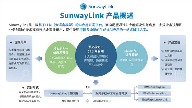 SunwayLink是一款基于LLM(大語言模型)的AI應(yīng)用開發(fā)平臺(tái),面向期望通過AI應(yīng)用解決業(yè)務(wù)痛點(diǎn)、支撐業(yè)務(wù)決策和業(yè)務(wù)創(chuàng)新的技術(shù)或非技術(shù)企事業(yè)用戶,提供快速搭建多場(chǎng)景的生成式AI應(yīng)用的一站式解決方案??梢蕴峁┝奶熘?、智能體、工作流三種應(yīng)用開發(fā)能力,開發(fā)好的應(yīng)用可快速封裝為API,可由后端或前端應(yīng)用直接調(diào)用,提供基于RAG(檢索增強(qiáng)生成)技術(shù)的可視化知識(shí)庫構(gòu)建能力,快速接入結(jié)構(gòu)化和非機(jī)構(gòu)化數(shù)據(jù)構(gòu)建個(gè)人和企業(yè)知識(shí)庫。