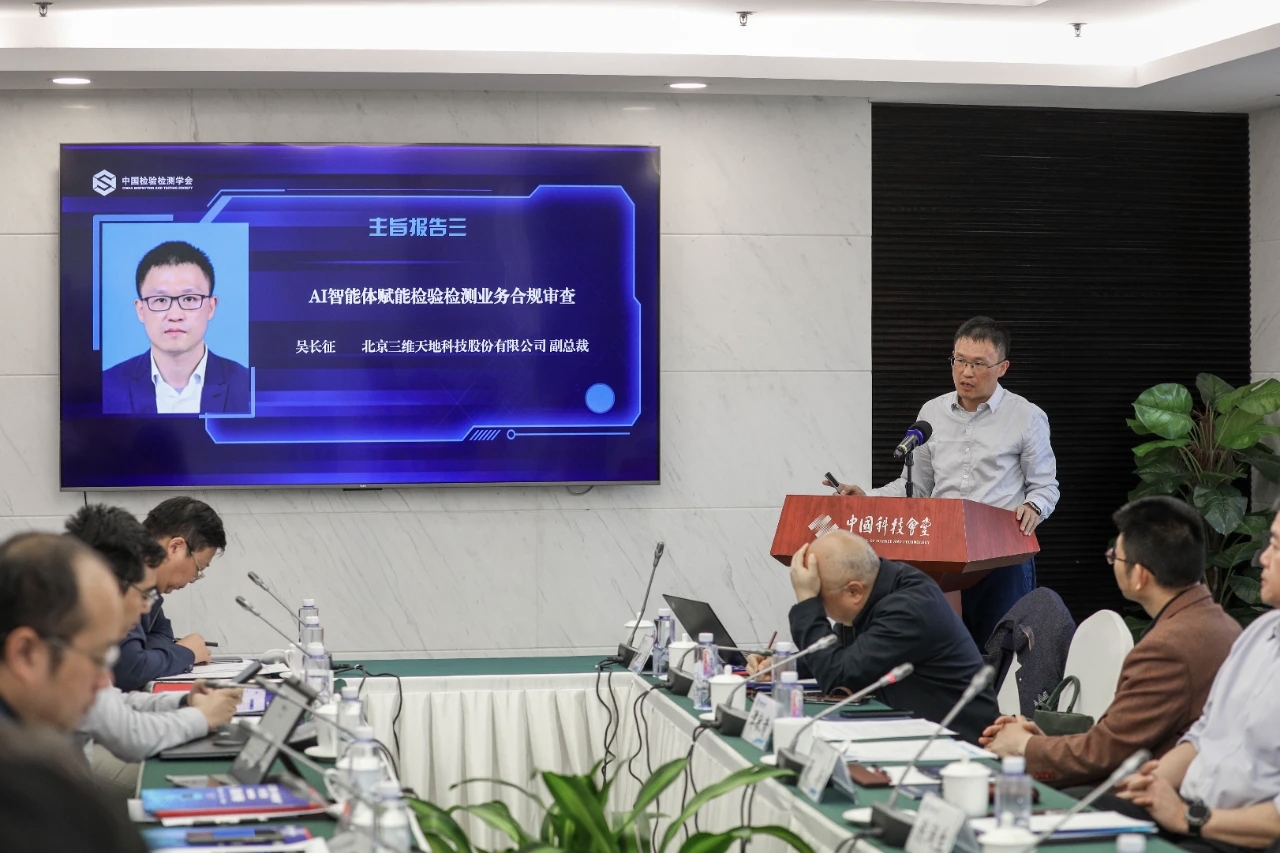 下午的研討在中國(guó)科技會(huì)堂舉行,議題聚焦“人工智能+檢驗(yàn)檢測(cè)”的科學(xué)前沿、治理挑戰(zhàn)與產(chǎn)業(yè)創(chuàng)新。三維天地副總裁吳長(zhǎng)征發(fā)表了題為《AI技術(shù)在檢驗(yàn)檢測(cè)合規(guī)及資質(zhì)技術(shù)評(píng)審中的應(yīng)用》的主旨報(bào)告。